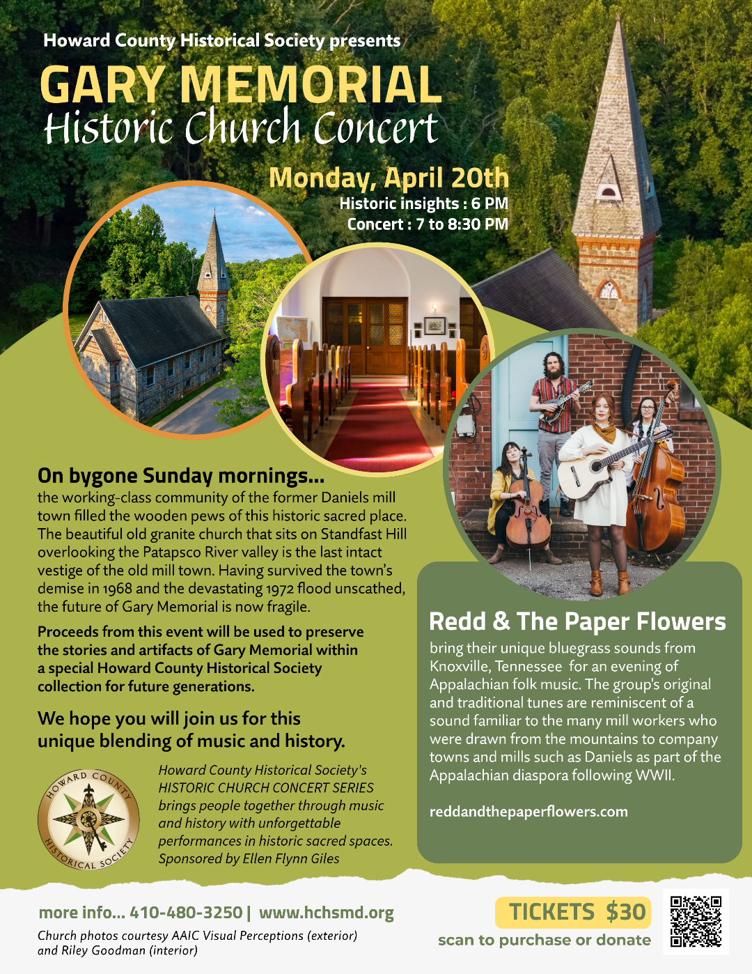 We hope you will join us for this unique blending of music and history when the Howard County Historical Society presents Redd & The Paper Flowers as part of their Historic Church Concert Series. Hailing from Knoxville, Tennessee, the group will bring their unique bluegrass sounds of Appalachian folk music. Their original and traditional tunes are reminiscent of a sound familiar to the many mill workers who were drawn from the mountains to company towns and mills such as Daniels as part of the Appalachian diaspora following WWII.
